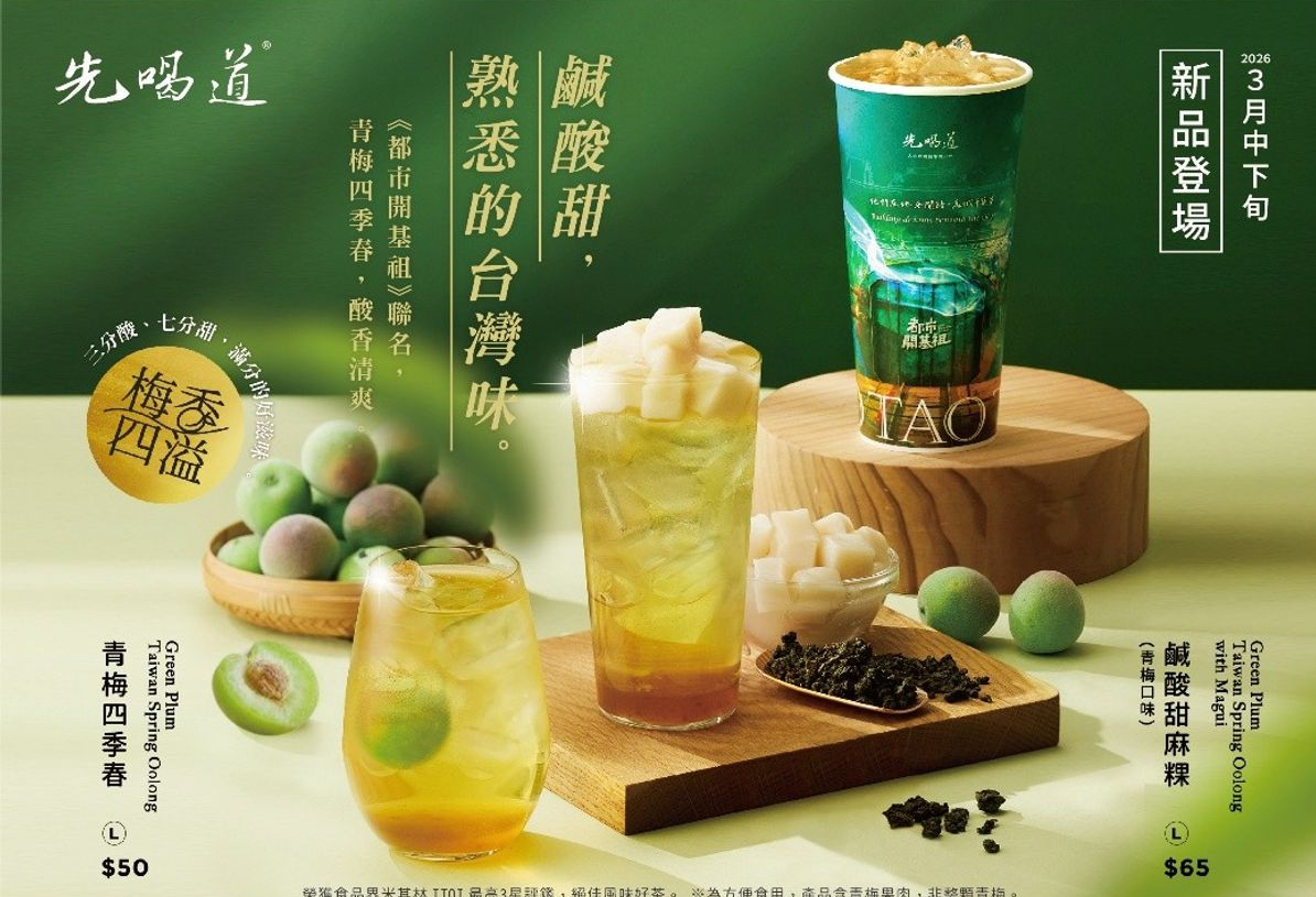3月與客家電視台年度大戲 《都市開基祖》 聯名的先喝道,趁勢推出兩款青梅系列新品,嚴選清香四季春茶加入酸甜青梅的「青梅四季春」;還將青梅做成特製香甜麻粿,鹹香新配料登場。